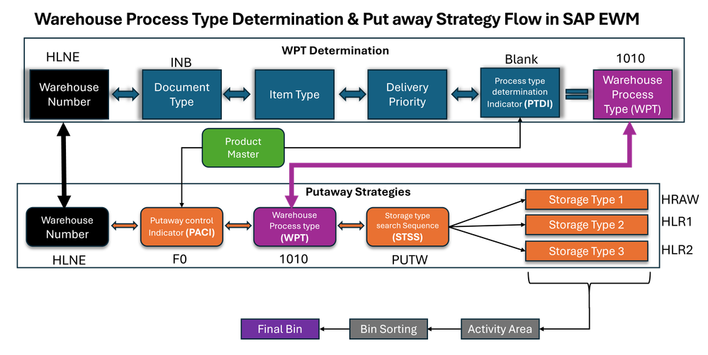 This visual illustrates how Warehouse Process Type (WPT) determination and putaway strategy work together in SAP Extended Warehouse Management. The diagram explains the end-to-end logic used by the system to decide how and where a product is put away in the warehouse after inbound processing. It connects document attributes, master data, and strategy settings to the final storage bin determination, helping readers understand the decision chain behind putaway execution.